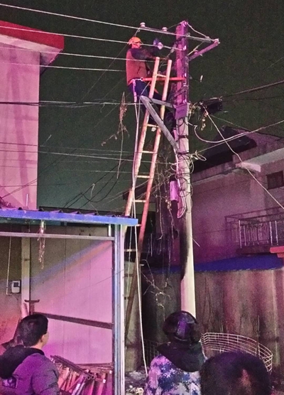 東辛“電雷鋒”們在寒夜接到故障消息后,第一時間趕赴現(xiàn)場,他們克服道路冰凍行走困難、電桿覆冰攀爬濕滑等不利因素,頂著刺骨的寒風(fēng),咬緊牙關(guān)一步一個腳印,仔細進行設(shè)備檢查和維修,在桿上艱難地完成每一個動作,一刻也沒有停歇,以最快速度搶修受損線路恢復(fù)居民用電。