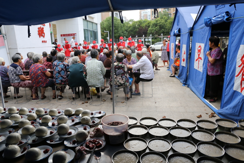 7月22日,早上5點多,第一天參加活動的支部黨員已早早來到通盛社區莫文隋愛心粥服務點,開始了一個忙碌而有意義的早晨。黨員志愿者們身著紅色馬甲,與其他志愿者一起為當天前來就餐85位孤寡老人、殘疾人、環衛工端飯送菜,忙碌不停,用最直接、最貼心的語言、行動,送上溫暖和關愛。就餐者一句簡單的謝謝,讓黨員志愿者心中都涌動著難以言盡的感