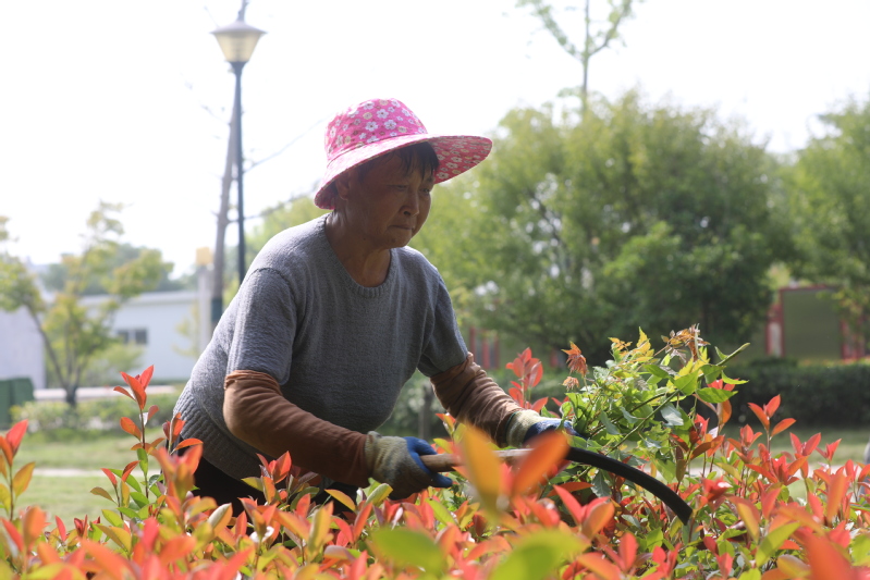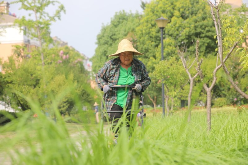 7月27日,寶應(yīng)湖農(nóng)場(chǎng)職工文化公園,7名工人正在為公園綠化除草。越是高溫雜草長(zhǎng)得越旺。以席正英為隊(duì)長(zhǎng)的綠化員們分工合作。草坪上用電動(dòng)切草機(jī)清理,隨著“隆隆”的機(jī)聲,切碎的草屑在刀頭間飛濺,濺到了工人的身上、飛上了工人的臉龐,刺癢刺癢,淡淡的青草味洋溢在夏日的晨光里。綠化帶里,爬騰類的雜草枝枝蔓蔓,覆蓋的綠化樹(shù)上,工人們就用手先拉斷經(jīng)脈,再扯掉枝葉;低矮類的雜草擁擠在綠化樹(shù)間,工人們蹲下身子就用手拔、用刀割。當(dāng)天7名工人清理綠化300多平方米。