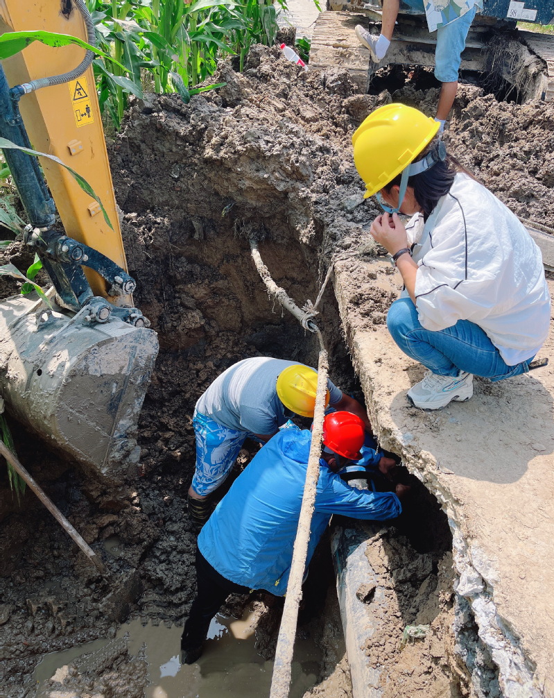 早上6點多鐘,淮海農場神禾路西側水泥路旁突然滲起水來,這立刻引起周邊居民的注意。射陽縣水務公司淮海分公司負責人郭金紅在第一時間收到警情后,立刻率領公司其他3名搶修人員迅速趕到現場“會診”。
