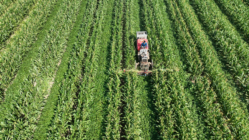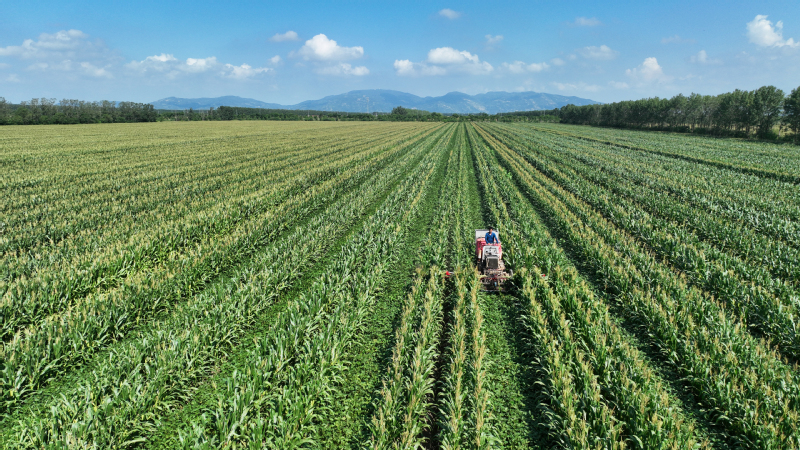 蘇墾農(nóng)發(fā)抓好12萬畝玉米大豆帶狀復(fù)合種植精細(xì)化管理,在去年成功試驗(yàn)的基礎(chǔ)上,組織農(nóng)機(jī)對玉米進(jìn)行去頂,既降低植株高度,減少倒伏風(fēng)險(xiǎn),又增加了玉米大豆受光面積,促進(jìn)產(chǎn)量提高。圖為農(nóng)機(jī)在蘇墾農(nóng)發(fā)東辛分公司玉米大豆田間進(jìn)行玉米去頂作業(yè)。