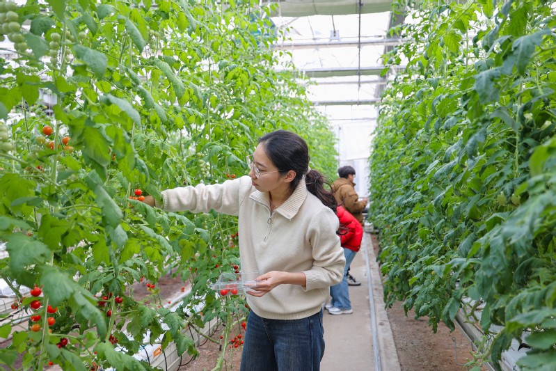 2月12日,在連云港市云臺(tái)農(nóng)場(chǎng)興墾科技番茄采摘智能玻璃溫室大棚內(nèi),工作人員在采摘采用無(wú)土栽培技術(shù)種植的西紅柿。 吳成瑤 攝 (視覺(jué)江蘇網(wǎng)供圖)