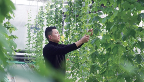 江蘇農(nóng)墾集團云臺農(nóng)場利用資源優(yōu)勢,積極與龍頭企業(yè)、科研機構(gòu)對接,開發(fā)特色種植。目前,與蘇墾麥芽公司訂單種植的大棚啤酒花長勢喜人。圖為技術人員正在為新長出的啤酒花側(cè)枝繞蔓。 程軍 攝