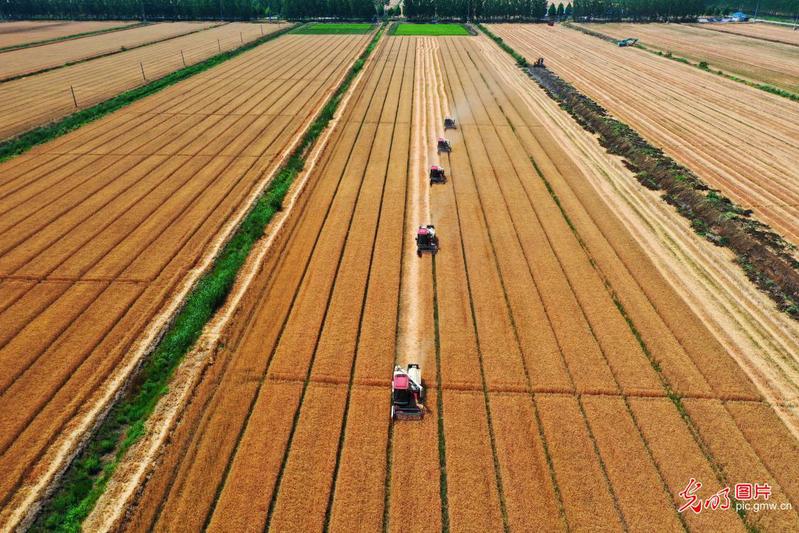 2025年6月4日,江蘇省連云港市海州區的江蘇農墾崗埠農場利用晴好天氣搶收成熟的小麥,現場五臺收割機一字排開,馳騁在金色的小麥田里,田間地頭一片繁忙豐收景象。(徐衛攝)