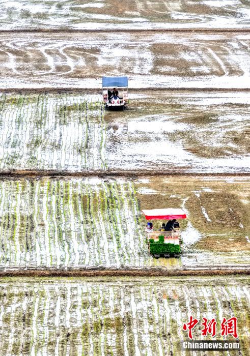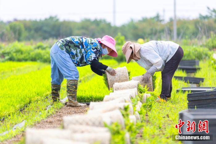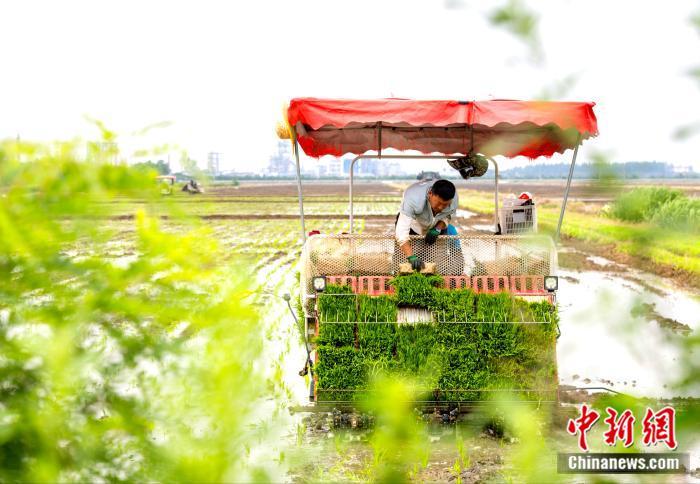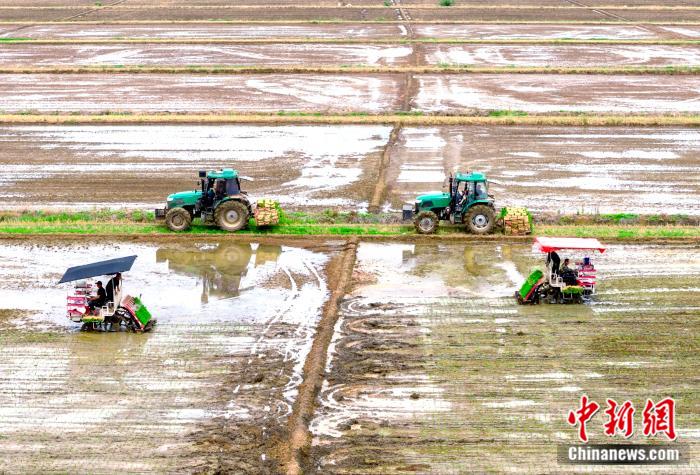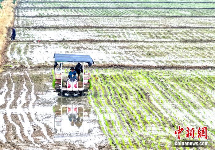 6月11日,江蘇省盱眙縣三河農場,農民正在進行機插秧作業。據了解,三河農場2025年水稻種植面積4.1萬畝,機插秧比例達到96-97%,機插秧不誤農時,比往年半人工插秧普遍縮短3~5天時間。 圖/CNSphoto 許昌銀 攝