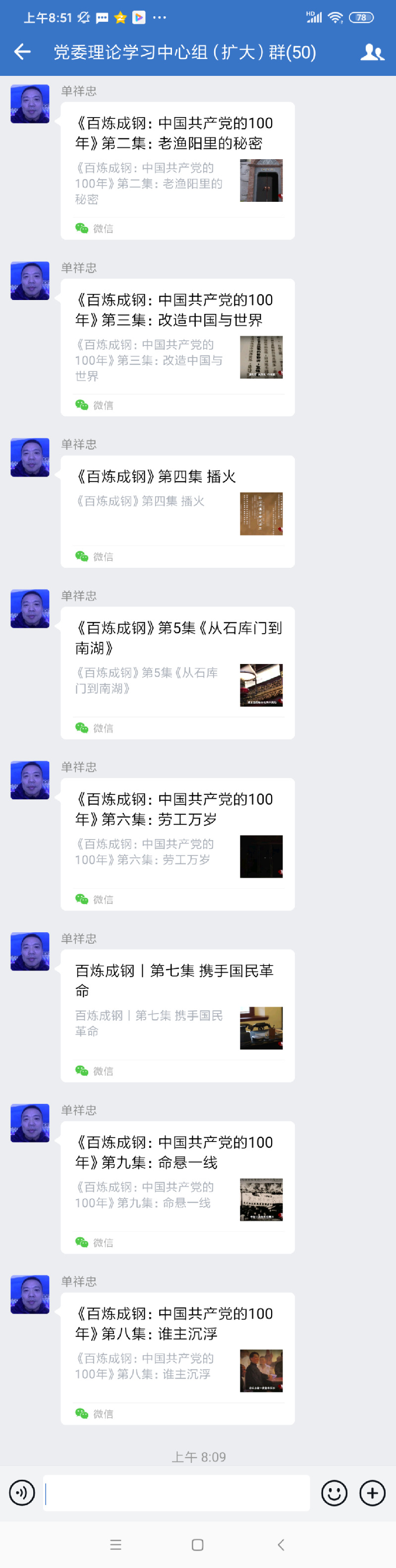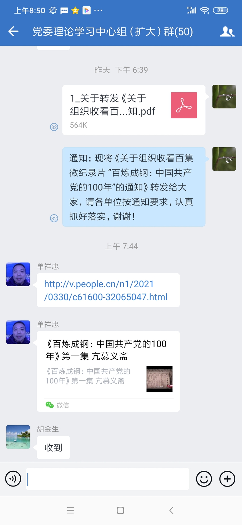 淮海農(nóng)場公司在昨天傍晚接到江蘇農(nóng)墾黨史學(xué)習(xí)教育第三組《關(guān)于組織收看百集微紀(jì)錄片百煉成鋼:中國共產(chǎn)黨的100年”的通知》后,立刻借助企業(yè)微信平臺(tái)黨委理論學(xué)習(xí)中心組(擴(kuò)大)群進(jìn)行轉(zhuǎn)發(fā)落實(shí),農(nóng)場黨委書記單祥忠在今天上午便將搜集來的《百煉成鋼:中國共產(chǎn)黨的100年》的紀(jì)錄片第1至第9集的視頻發(fā)布的學(xué)習(xí)群中,并以此來進(jìn)一步激發(fā)起廣大黨員干部職工學(xué)習(xí)黨史的熱情,在方便大家觀看學(xué)習(xí)中,不斷提升黨史的學(xué)習(xí)教育成效。