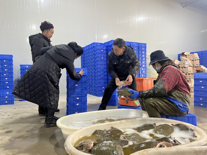 大年初八,走進濱淮農場養殖中心倉庫,一個個甲魚包裝盒整齊地擺放在地上,不遠處的工人們正有序地清洗檢查、稱重記錄、打包裝盒。“這批甲魚是一個淮安的客戶訂購的,他之前在網上了解過我們的產品,在購買品嘗后,認可了我們的質量,便又一次性買了60多只。”養殖中心主任李德前介紹說。濱淮農場生態甲魚經過年前幾個月的推廣,口味受到市場的認可。與周邊餐飲酒店建立了長期合作關系,成為春節走親訪友、聚會聚餐的美味佳品,訂單量也隨之增多,春節期間線上線下的每日訂單量是正常時間的三到五倍。為了保證節日期間的正常銷售,養殖中心提前做了大量工作。針對甲魚冬眠的習性,養殖中心組織人手下河探泥取魚,捕撈1000多斤甲魚,并挨個清洗,以清去泥腥味和排泄物。同時對每只甲魚進行稱重,貼好標簽放入“單身公寓”中凈養,把銷售的前期工作做優做好。李德前表示,“養殖中心的工作比較特殊,塘口時刻需要有人在崗。春節假期,我們對現有人員進行了分工,在做好魚塘管理的同時,也要注重甲魚的銷售,保證24小時有管理人員在銷售點,及時做好銷售工作。”黑魚作為濱淮農場的另一個特色產業,當前主要工作是抓好在塘黑魚苗和成魚的管理。“根據農場產業發展規劃,
