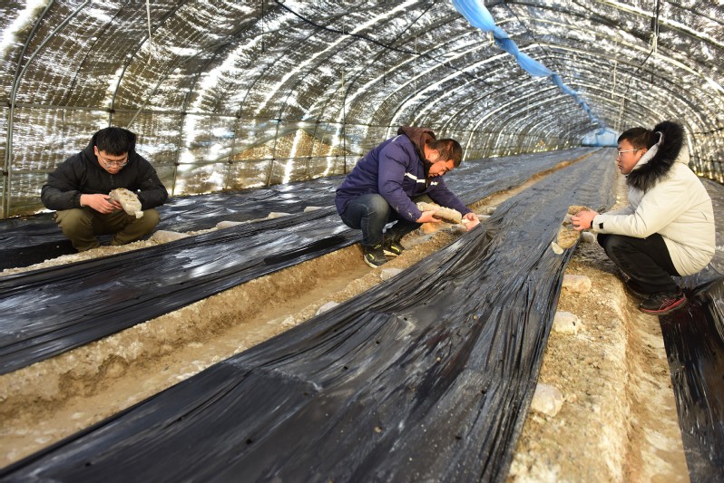 連日來,淮海農場在探索羊肚菌成功種植的基礎上,依托現有50畝大棚和林下資源,積極拓展羊肚菌規模化生產,以促進農場經濟的多元發展。圖為1月13日上午,產業發展中心技術管理人員在查看和交流膜下菌菇生長情況。