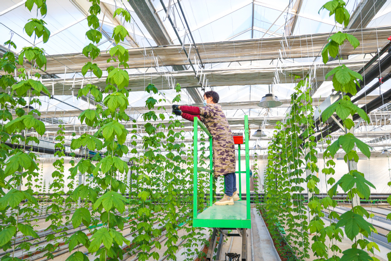 在云臺農場興墾科技現代智能玻璃溫室大棚內,大棚里的傳感器對棚內溫度、濕度等實時監測,并實時上傳。工作人員正站在采摘車上,為棚內的一株株啤酒花進行繞蔓。在啤酒花田間,一串串鈴鐺般的啤酒花在風中搖曳,散發出陣陣沁人心脾的芳香。據悉,今年云臺農場興墾科技采用無土栽培方式種植啤酒花,打造適宜啤酒花生長環境,不僅極大的降低了啤酒花病蟲害風險,更通過減少化學藥劑使用,保證了產出啤酒花的安全性,為國內啤酒花種植的創新和研究打下堅實基礎。云臺農場擁有2200㎡的現代智能玻璃溫室大棚,作為選址單位參與百威中國與江蘇省農墾麥芽有限公司共同簽署了全新啤酒花培育合作項目,旨在加強對現代化農業室內酒花種植技術的合作研發,圍繞產品、質量、產量、技術四大領域展開,包括研發新型酒花品種、提升現有酒花質量、增加現有酒花產量以及深化室內種植技術的研發和標準化。目前在現代智能玻璃溫室大棚內成活率達100%,現部分已經長出鮮啤酒花。“我們保留了幾株已經形成酒花的,其余部分剪切下來進行扦插擴繁,為百威亞太公司五月份的大麥節做準備,扦插完成后,現園區啤酒花達780株,近期對后一批次到的青島大花和馬可波羅品種,也進行扦插擴繁定植,