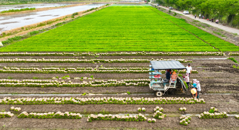 端午假期第一天,蘇墾農(nóng)發(fā)南通分公司3大隊(duì)田頭一片忙碌景象。烈日下,7位農(nóng)技人員彎著腰在水稻田一字排開移栽秧苗,腳下步履維艱、鼻頭汗珠滴落。按照隊(duì)伍兩頭農(nóng)技人員手拉的直線,他們小心翼翼地從秧盤上取下秧苗,左手握苗,右手插秧,確保行距25厘米,株距20厘米,每穴2株,橫豎成線、深度適中。每隔一段距離,田間都會(huì)插上一塊寫明實(shí)驗(yàn)數(shù)據(jù)的標(biāo)簽。“不同的標(biāo)簽對(duì)應(yīng)了不同的試驗(yàn)稻種。人工插秧可以確保水稻增產(chǎn)試驗(yàn)的科學(xué)性、嚴(yán)謹(jǐn)性、準(zhǔn)確性。”蘇墾農(nóng)發(fā)南通分公司農(nóng)業(yè)中心主任趙中華表示。今年,蘇墾農(nóng)發(fā)南通分公司大力推進(jìn)農(nóng)業(yè)科技創(chuàng)新,與南通大學(xué)生命科學(xué)學(xué)院合作開展水稻高產(chǎn)技術(shù)研發(fā),為南通稻米產(chǎn)業(yè)供給性結(jié)構(gòu)優(yōu)化、品質(zhì)提升、節(jié)本增效和綠色高產(chǎn)提供技術(shù)支撐。前期,校企雙方分別對(duì)南粳46、南粳5055稻種以微波、離心、超聲波等3種方式,按時(shí)間長(zhǎng)度各進(jìn)行32種處理。落谷前,蘇墾農(nóng)發(fā)南通分公司對(duì)不同品種、不同處理的水稻種子提前進(jìn)行了篩選、收集、稱重、貼標(biāo)、裝袋等準(zhǔn)備工作,同時(shí)與相關(guān)農(nóng)業(yè)大隊(duì)溝通協(xié)調(diào)好浸種催芽時(shí)間,在種子露白后及時(shí)安排工人與農(nóng)機(jī),掌握好落谷的最佳時(shí)機(jī)與最優(yōu)質(zhì)量,控制種子秧盤播撒的均勻度,精準(zhǔn)把控好土壤濕度與精細(xì)