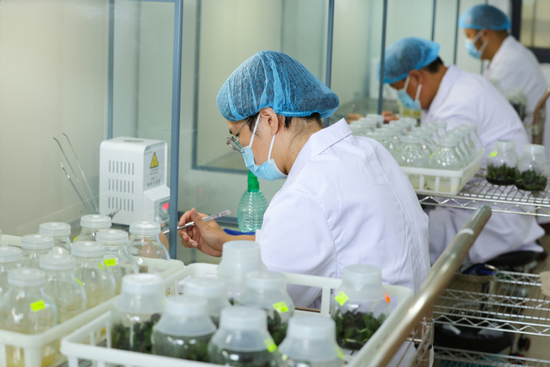 云臺農場攻克了蝴蝶蘭花苗培育中的技術瓶頸,運用科技手段實現了蝴蝶蘭花苗的智能化流水線生產。圖為技術人員正“全副武裝”在潔凈的操作間里忙碌,精心制作培養基。
