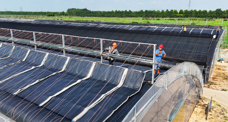7月29日,連云港市海州區崗埠農場,工作人員正在檢查、加固蔬菜大棚,防范臺風“竹節草”。