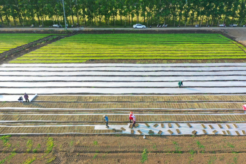 在蘇墾農(nóng)發(fā)崗埠分公司田頭,職工們正在把經(jīng)“暗化”后的秧盤移到大田里,采用微噴灌技術(shù)進(jìn)行集中育秧,加強(qiáng)精準(zhǔn)水肥調(diào)控、集中標(biāo)準(zhǔn)化育秧管理,為即將開展的機(jī)插秧作業(yè)夯實(shí)基礎(chǔ)。