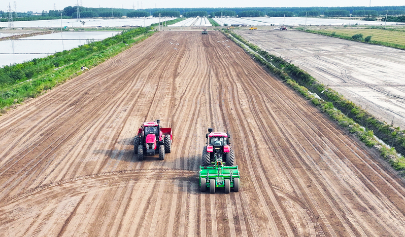 5月25日,蘇墾農(nóng)發(fā)弶港分公司第二生產(chǎn)區(qū)8連田間,北斗衛(wèi)星導(dǎo)航鏟運(yùn)機(jī)、激光平整機(jī)等25臺(tái)套大型機(jī)械來回穿梭,全力推進(jìn)土地平整進(jìn)度。